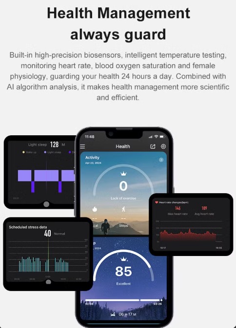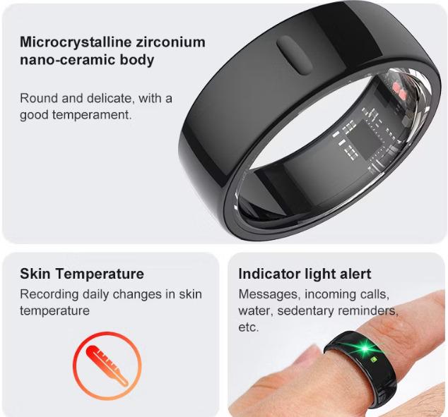 Unique Self-developed design Rich applications (Health monitoring, Pedometer,Calorie Consumption, Distance, Heart Rate. female physiological reminder, skin temperature measurement, HRV,NFC,LED indicator.